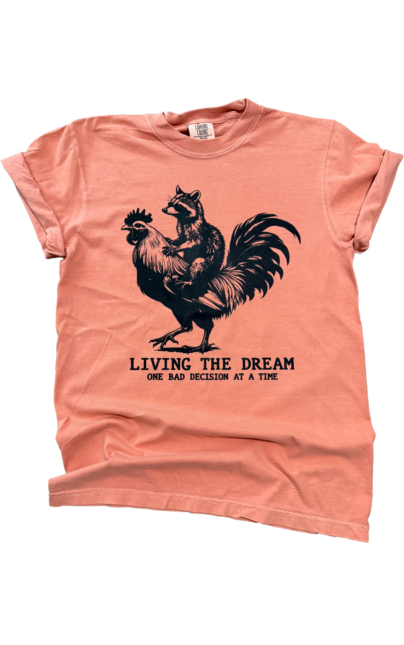 Because sometimes “living the dream” just means making questionable choices and rolling with it. A raccoon riding a chicken? Iconic. Add the tagline “One Bad Decision at a Time” and you’ve got yourself a whole lifestyle tee. Soft, comfy, and guaranteed to spark conversation (or concern).