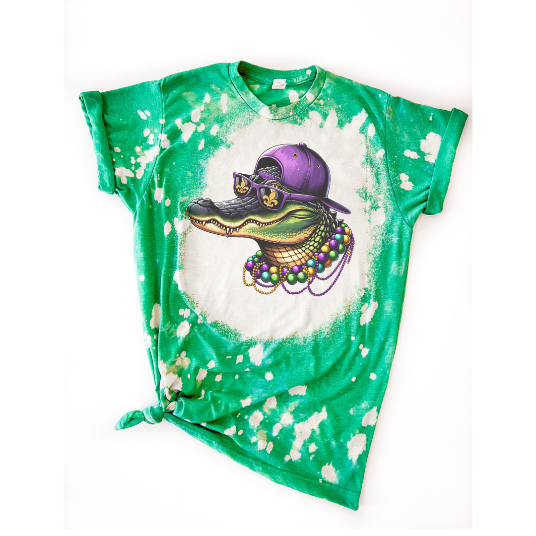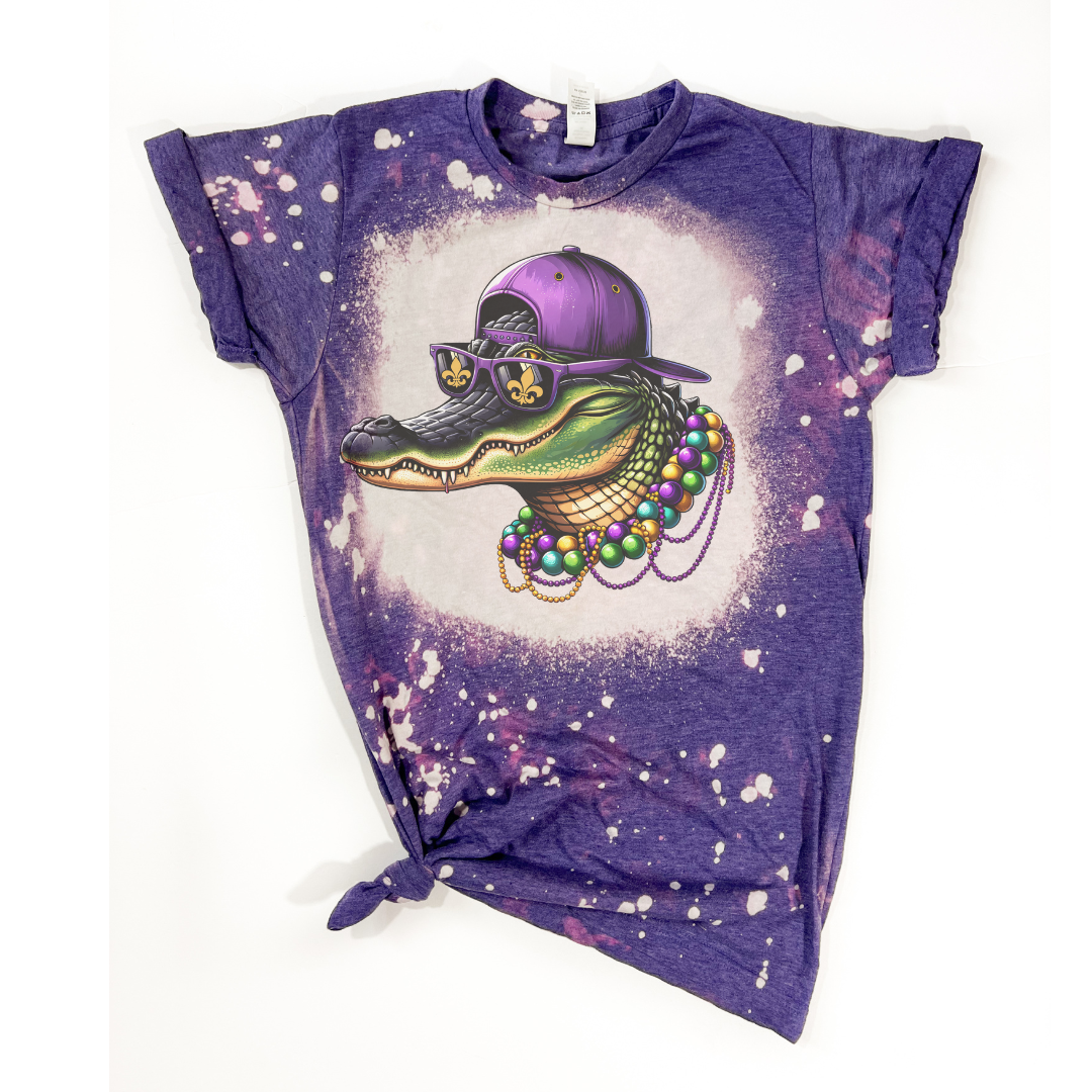 A vibrant purple bleached-style T-shirt featuring a playful and bold graphic of an alligator wearing a purple baseball cap adorned with fleur-de-lis symbols and a pair of matching sunglasses. The alligator is accessorized with colorful Mardi Gras beads in green, gold, and purple, capturing the festive spirit of Mardi Gras.