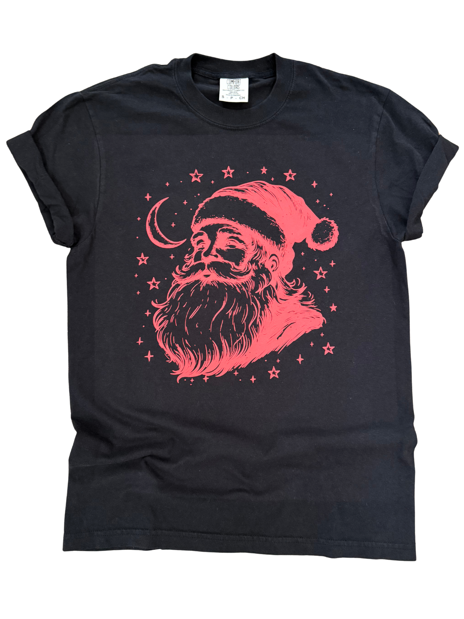 The witchy sister of your classic Santa tee. Deep black fabric + hot red ink + celestial details = Christmas… but make it moody. If festive goth was a shirt, this is it.