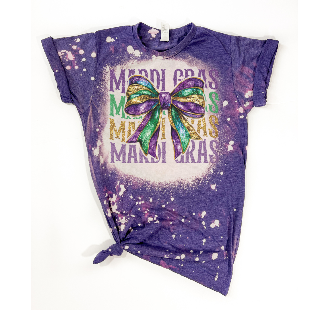 A vibrant purple bleached-style T-shirt featuring a festive Mardi Gras design. The graphic showcases a large, glittery bow in green, gold, and purple—traditional Mardi Gras colors—centered over repeated text that reads "Mardi Gras" in a layered pattern.