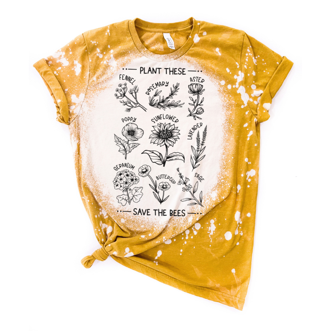Save the bees, and look good doing it with our bleached mustard tee. Made from soft, sustainable fabric, this tee features a playful flower design. Plus, each shirt sold helps plant flowers to support our buzzing friends. A win-win for you and the environment!