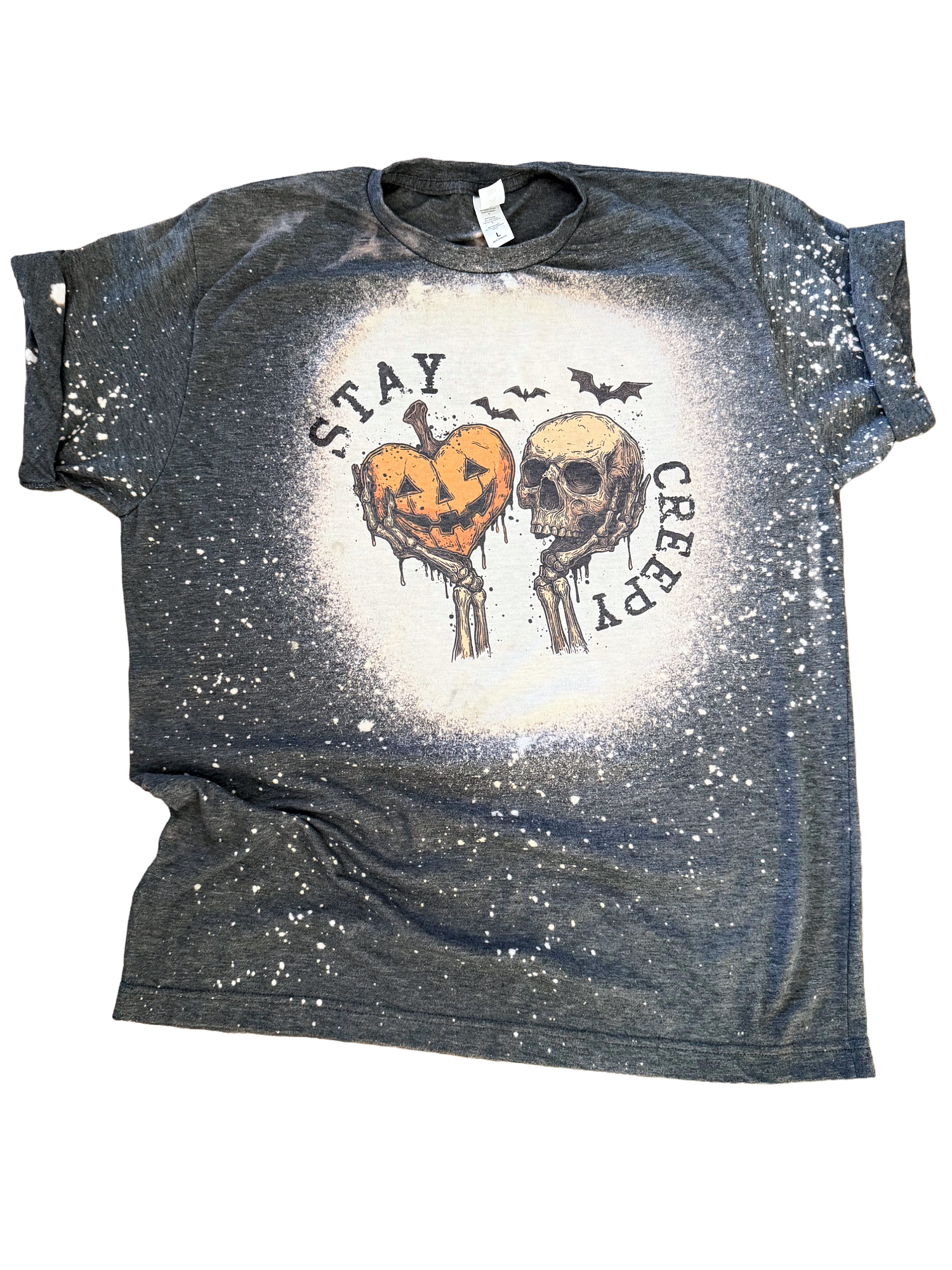 When October lives in your heart year-round. This black bleached tee features skeletal hands holding a grinning jack-o’-lantern and a weathered skull—equal parts eerie and iconic. Perfect for Halloween diehards, horror fans, or anyone who prefers their wardrobe a little dark and creepy.